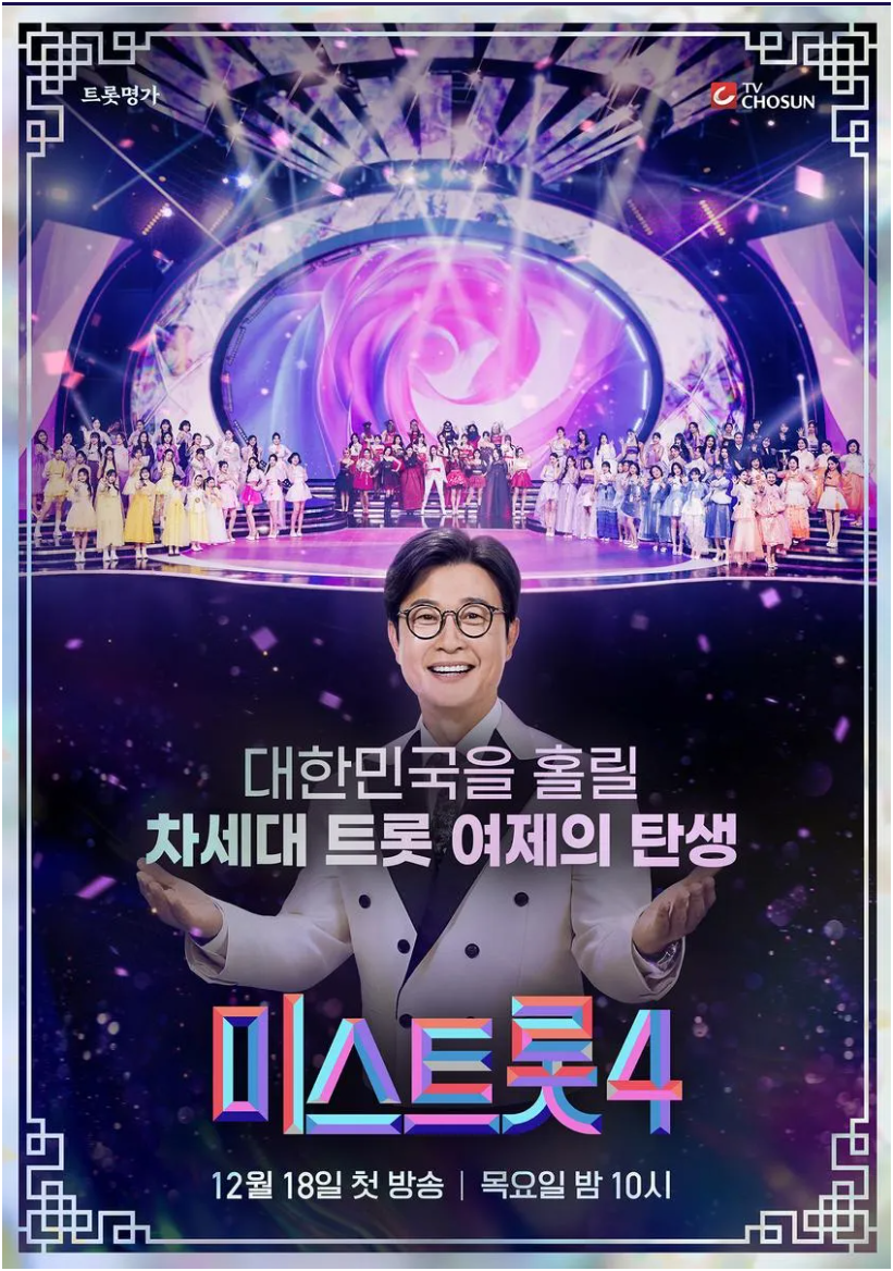 2023년 전국을 뜨겁게 달군 트로트 열풍이 다시 시작됩니다. 많은 팬들이 기다려온 TV조선의 간판 예능 프로그램, 바로 ‘미스트롯4’가 오는 2025년 12월 18일 목요일 오후 10시에 전격 방송을 시작합니다. 시즌마다 엄청난 화제성과 시청률을 기록해온 미스트롯 시리즈는 대한민국 트로트계의 판도를 바꾸는 대표 프로그램으로 자리 잡았는데요, 이번 시즌은 더 강력한 참가자들과 새로운 심사 시스템, 한층 업그레이드된 무대를 예고하며 기대를 모으고 있습니다.