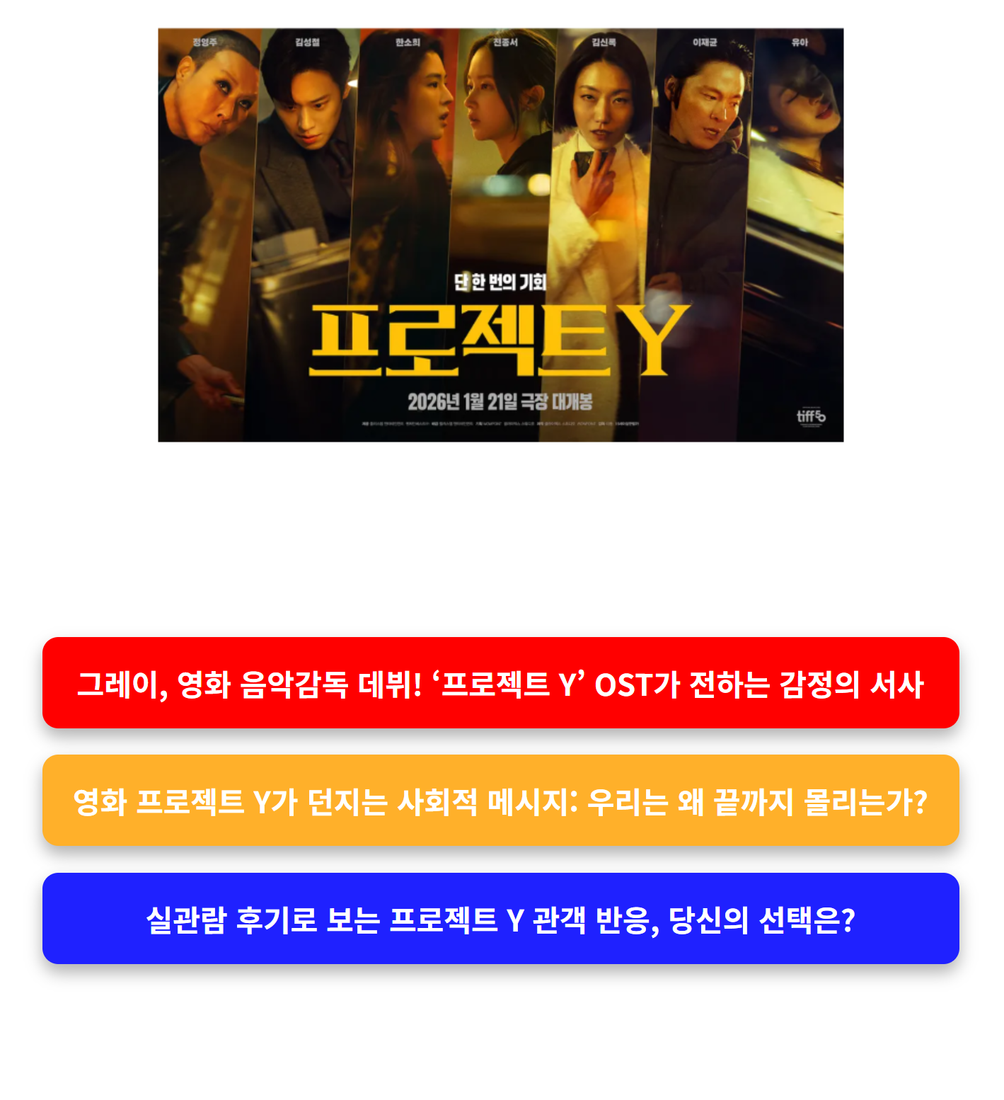 영화 ‘프로젝트 Y’, 개봉과 동시에 화제를 모으며 박스오피스 상위권을 유지 중입니다. 🎬