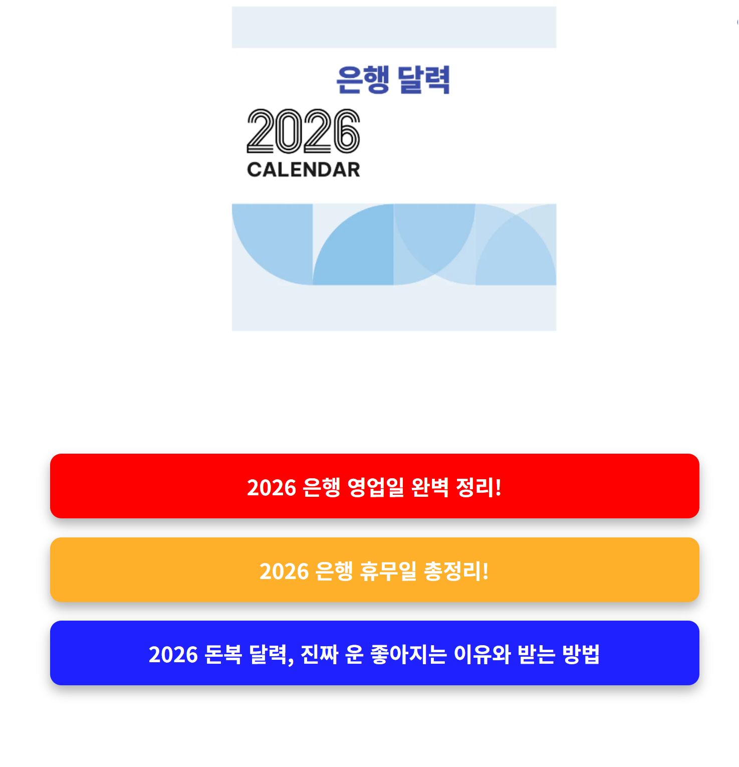 2026년 은행 달력, 단순한 날짜표가 아닙니다. 절기, 황금날짜, 금융 일정까지 담긴 실용적인 ‘돈복 달력’으로, 매년 연말이면 꼭 챙겨야 할 아이템이 됐습니다. 은행별 일정과 방법만 잘 확인하면 누구나 무료로 받을 수 있으니, 지금 바로 앱 열고 이벤트 알림 확인해보세요!